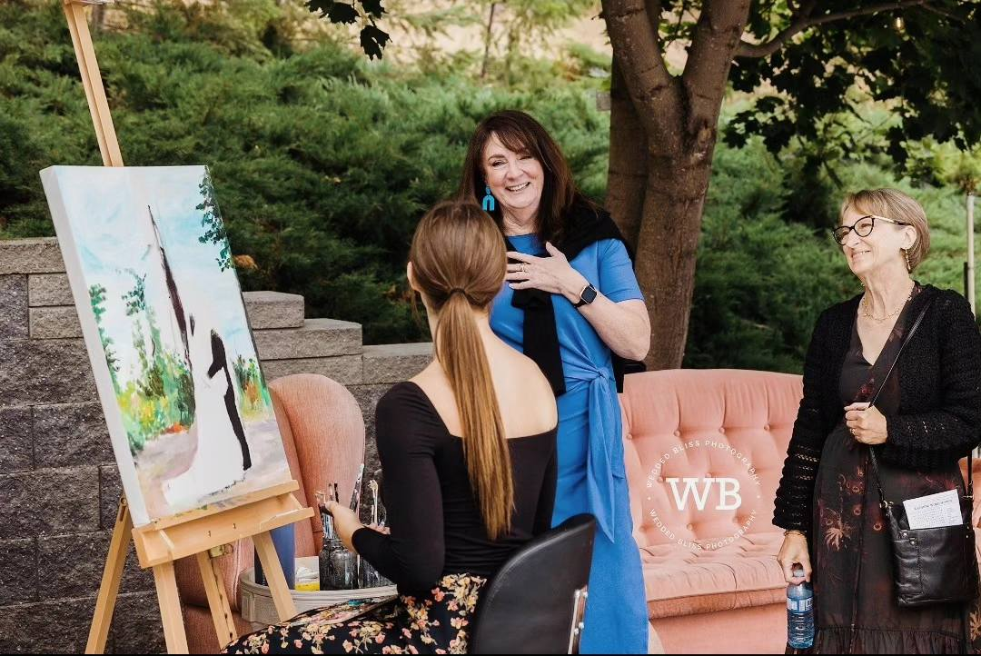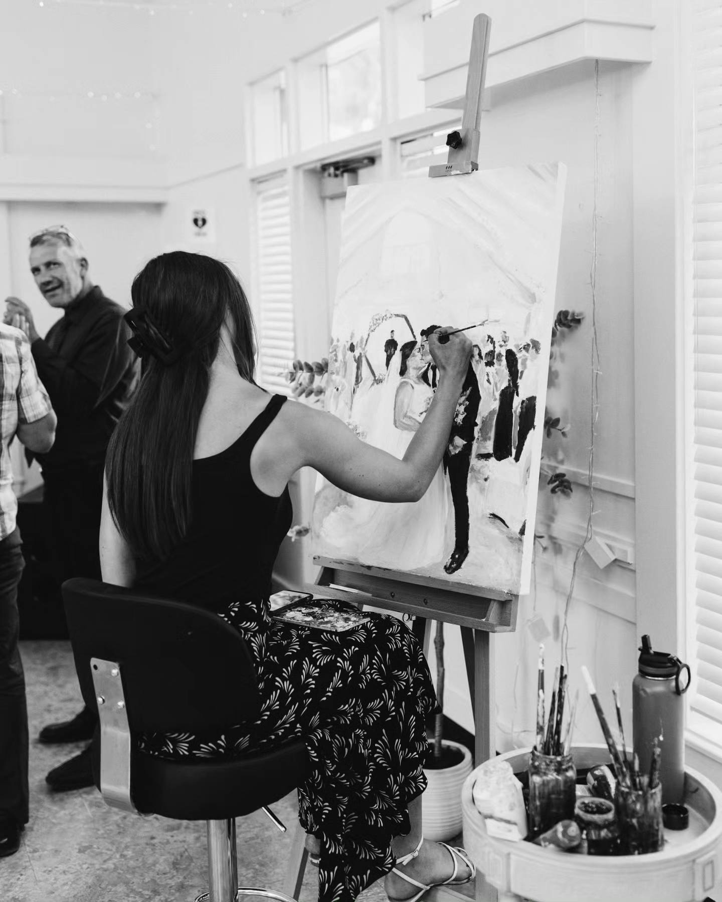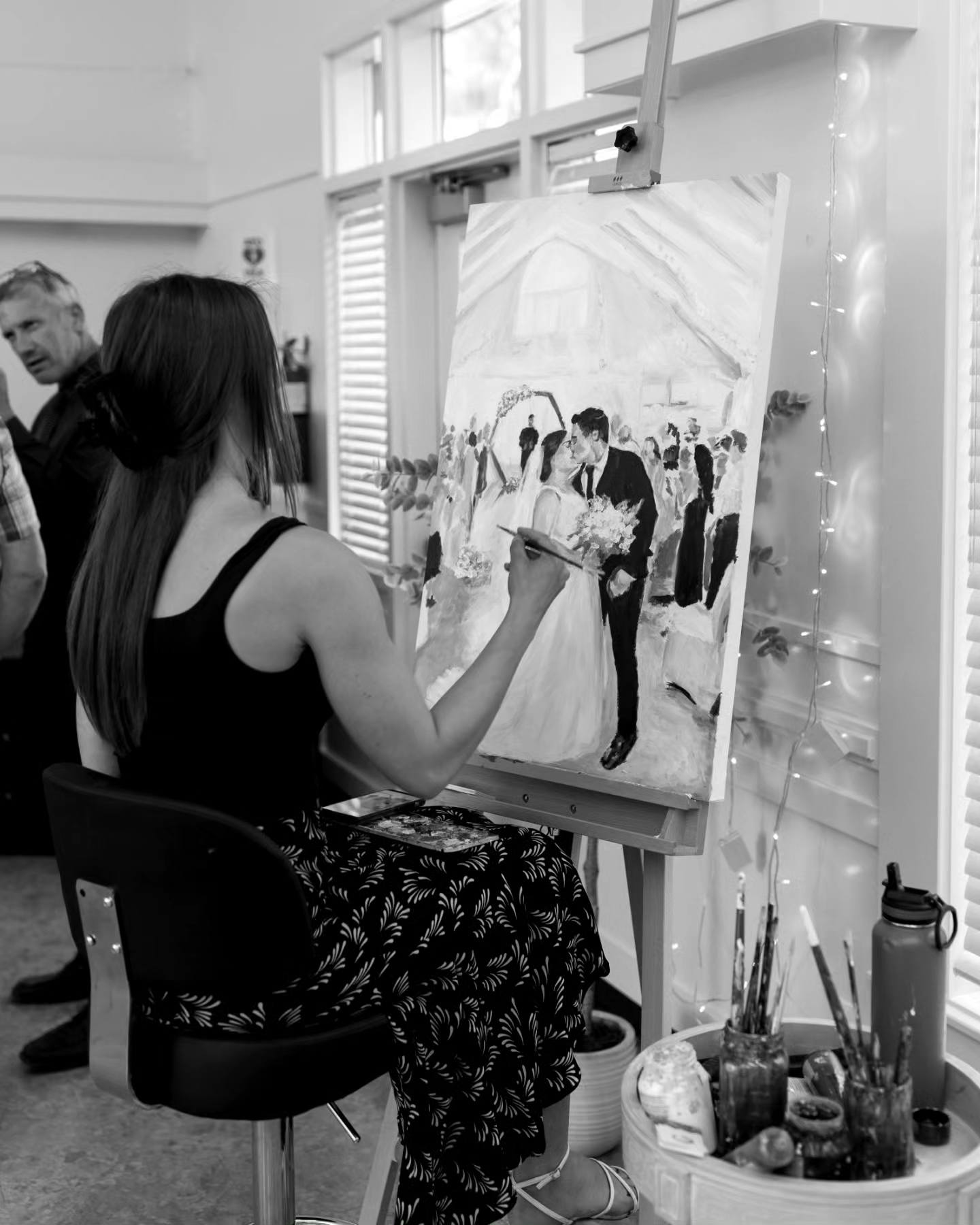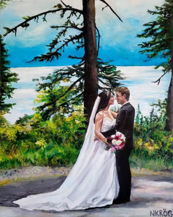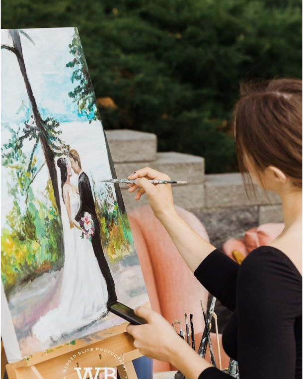 The service that I offer includes using a photo taken at or before the ceremony, and painting it live during reception, and into the evening of the special day. To do this, I work with the hired photographer for the day, to ensure maximum efficiency and quality of the photograph used. I then take the piece home for the following 4-8 weeks, to detail, varnish, and make the painting display ready for the couple’s home. This process allows for the live painting experience to be had, while still promising a high quality final result for the home.