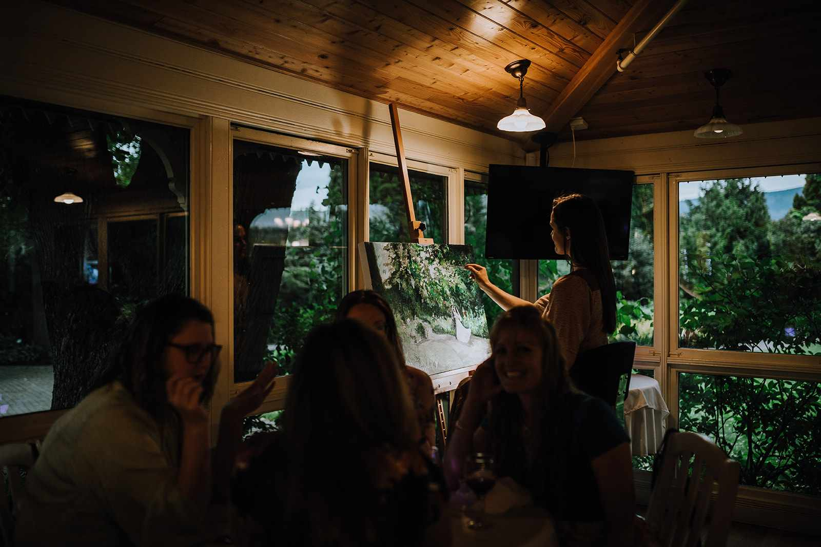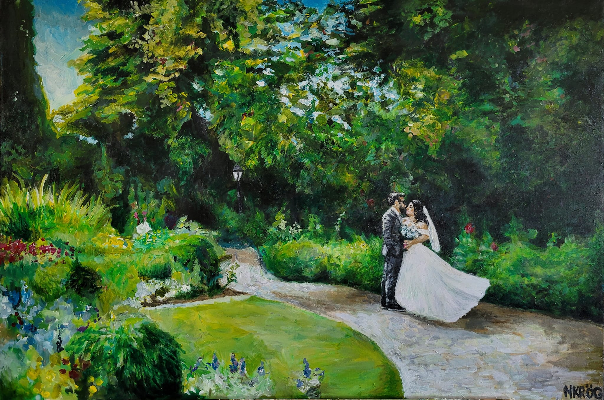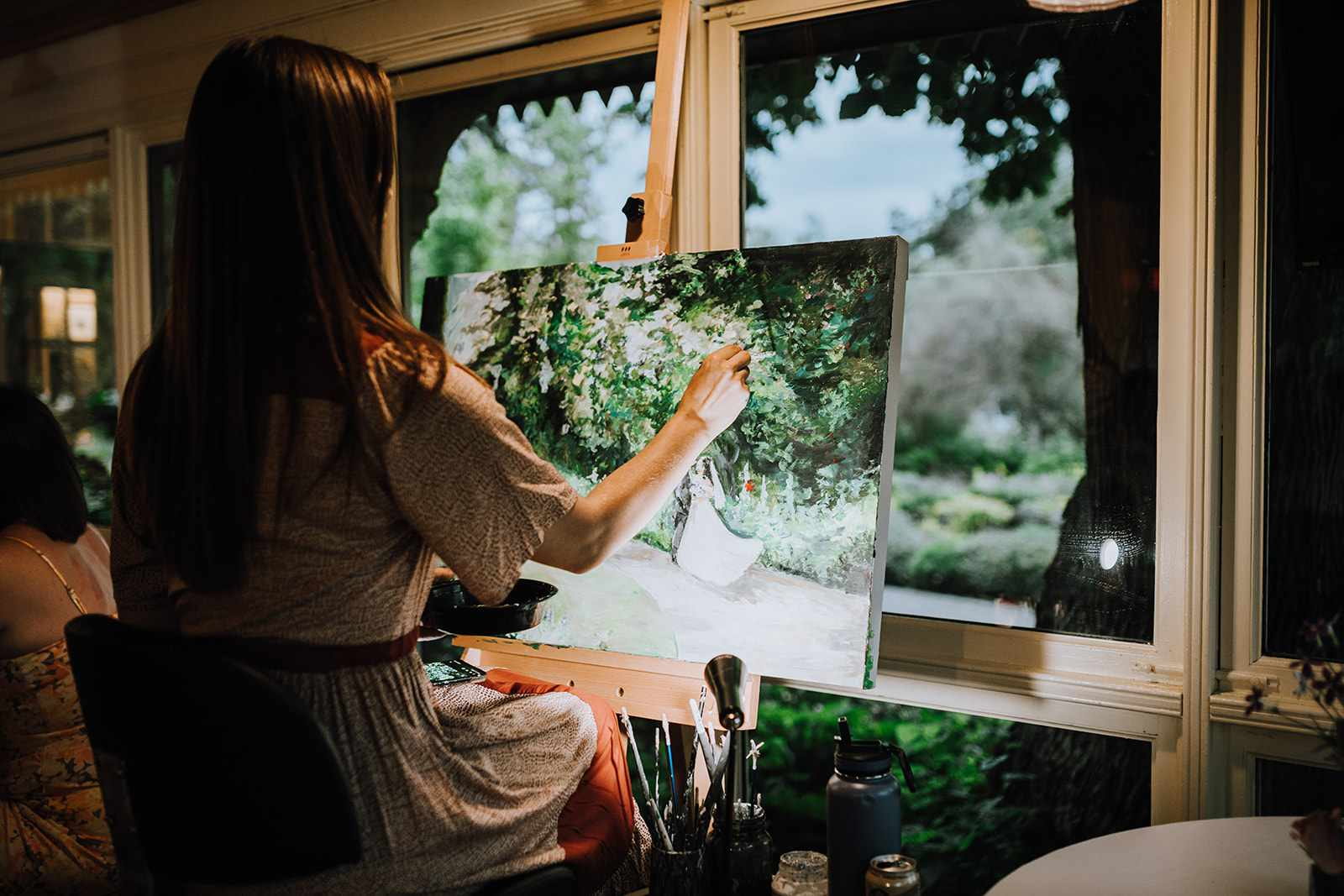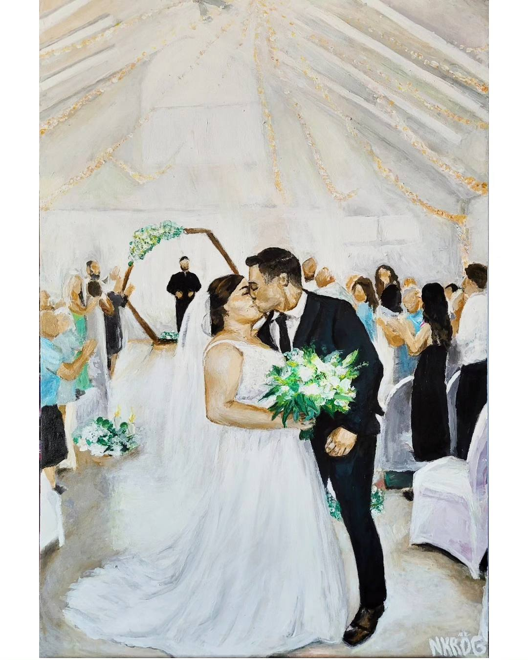 The service that I offer includes using a photo taken at or before the ceremony, and painting it live during reception, and into the evening of the special day. To do this, I work with the hired photographer for the day, to ensure maximum efficiency and quality of the photograph used. I then take the piece home for the following 4-8 weeks, to detail, varnish, and make the painting display ready for the couple’s home. This process allows for the live painting experience to be had, while still promising a high quality final result for the home.